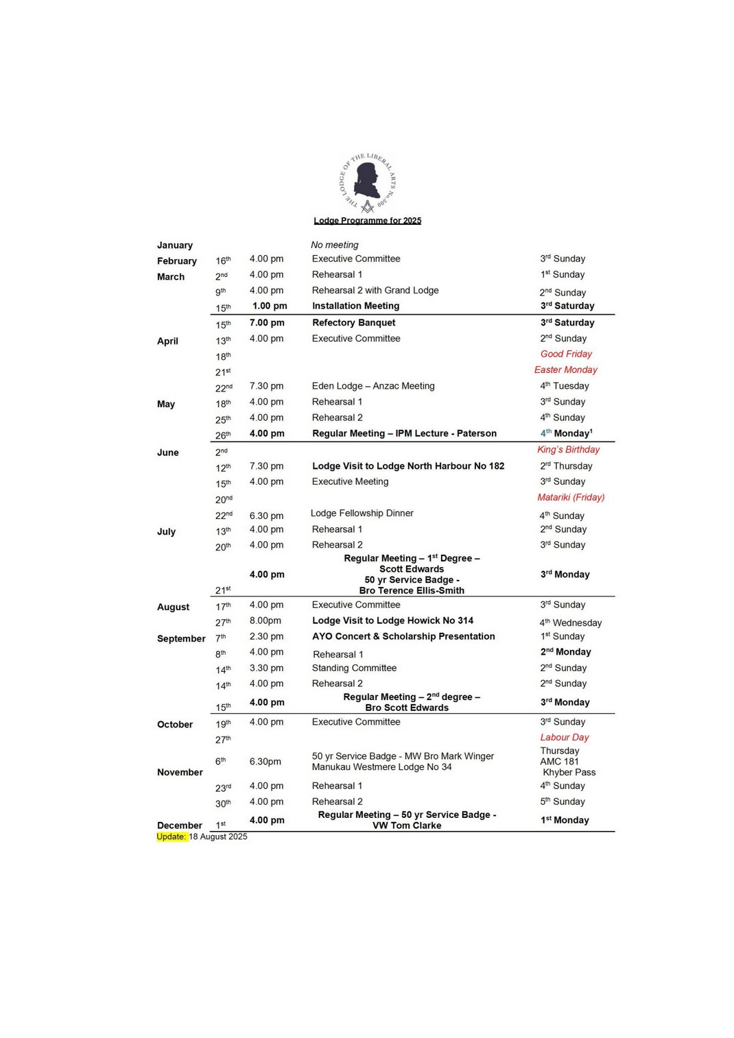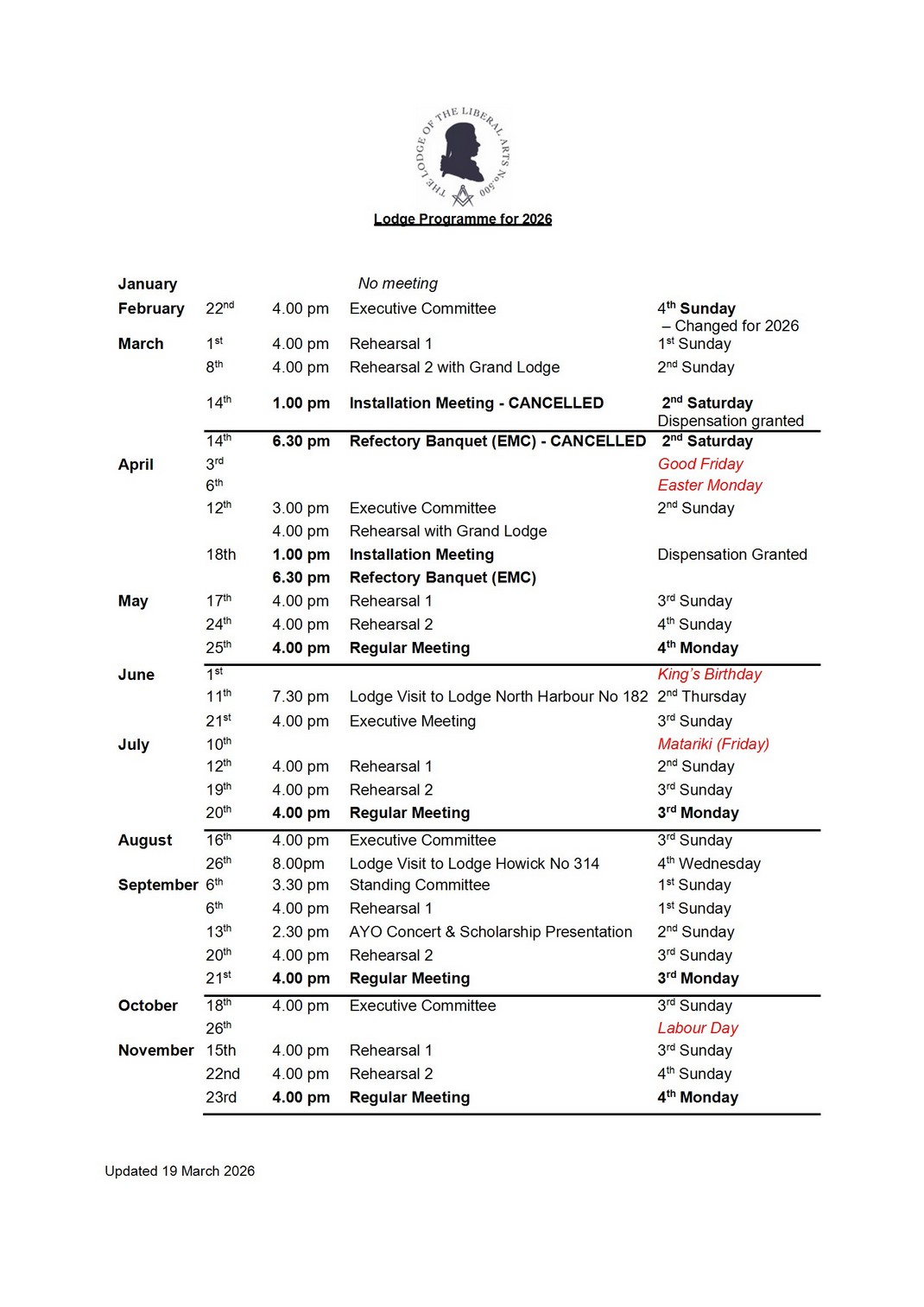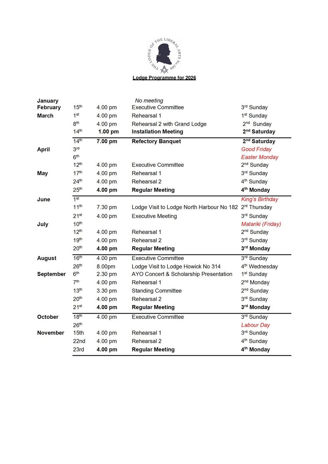 Calendar - Lodge of the Liberal Arts